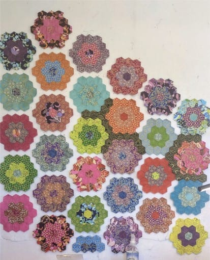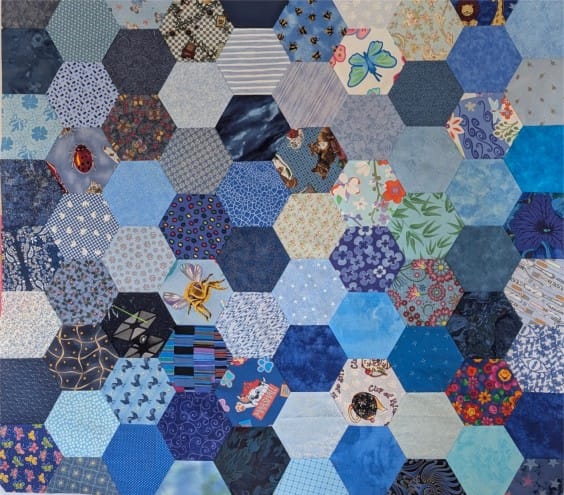 The blue Hexies are 2.5". I had made up a small sample of one "flower" when we first came out with these but I had no idea what size one package of blocks would make. I made half of this during our 3rd show and the next day, I made the other half. I have sewn the two halves together, added borders and right now, it is on the long arm and I am about half done quilting it. I will share the finished project next week during one of my Lives. It turned out to be a nice size lap quilt so now I am thinking about doubling or even tripling it for a bed-size quilt. It sure went together fast. By the way, there are 80 Hexies and I used 80 different fabrics from my stash.