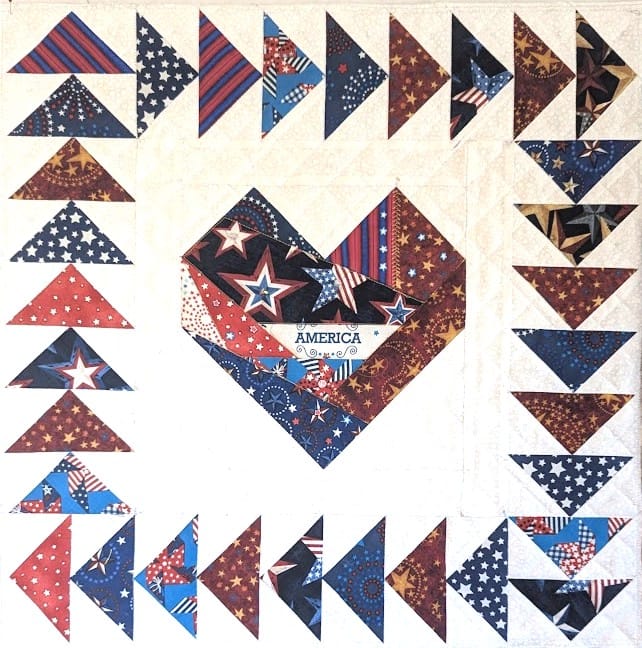 I had made this patriotic version before I started the show and I started to embellish it. This one will be a wall hanging to celebrate our country's 250th birthday in a couple of months. I have a bunch of red, white and blue star buttons that I will be sewing on and then add some glitz with some shiny baubles. I am pleased with how I fussy cut the one little piece of fabric I had that said "America" there in the middle.